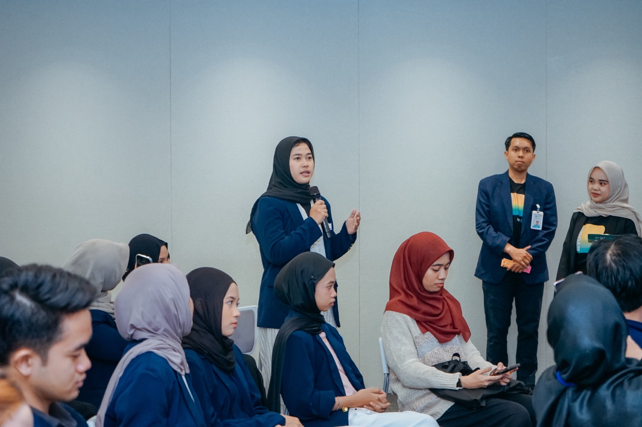 Company Visit ke BSI berlangsung hangat dan interaktif melalui sesi tanya jawab dua arah. Mahasiswa tampak antusias mengajukan pertanyaan, sekaligus tertantang untuk menjawab pertanyaan yang dilontarkan oleh para pemateri. Suasana semakin seru saat kegiatan dilanjutkan dengan permainan spin wheel. Mahasiswa yang beruntung berkesempatan membawa pulang berbagai merchandise resmi Bank Syariah Indonesia.