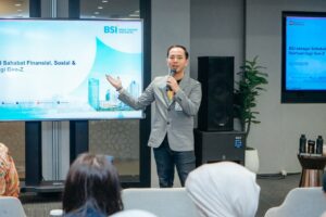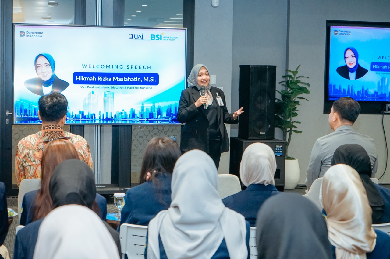 Pada sesi pemaparan dari pihak BSI, Vice President Islamic Education & Halal Solution BSI, Hikmah Rizka Maslahatin, M.Si., menyampaikan bahwa BSI yang kini resmi menjadi bagian dari Danantara Indonesia terus mendorong literasi serta inklusi perbankan syariah melalui kolaborasi dengan perguruan tinggi. Beliau menegaskan bahwa perbankan syariah telah berkembang secara modern dan kompetitif, serta membuka peluang bagi generasi muda melalui program pengembangan talenta seperti Officer Development Program (ODP).