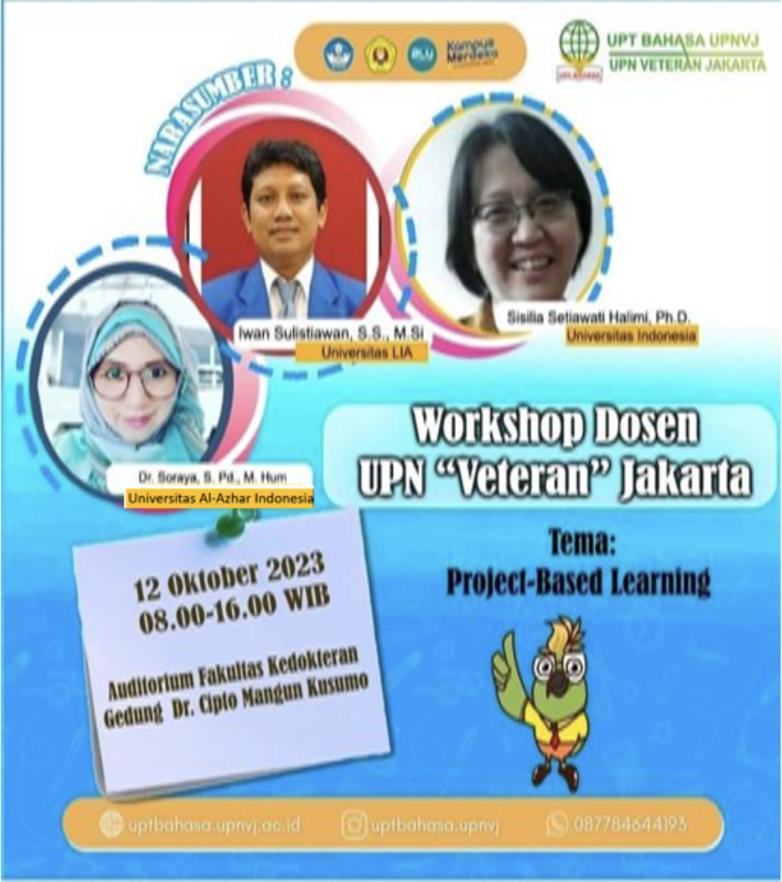 Workshop yang digelar oleh Unit Pelaksana Teknis Bahasa UPN Veteran Jakarta pada Kamis, 12 Oktober 2023 menghadirkan bahasan mendalam tentang penyusunan lesson plan untuk pendekatan Project-Based Learning (PjBL). Kegiatan ini menghadirkan tiga narasumber berpengalaman: Sisislia S. Halimi, Ph. D., Dr. Soraya, S. Pd., M. Hum., dan Iwan Sulistiawan, M. Si.