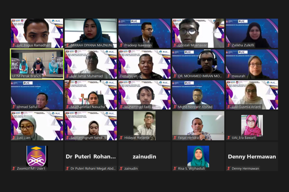 In order to formalize the cooperation between two institutions, UAI and UiTM Cawangan Perak penned a Memorandum of Collaboration (MoC) on January 17, 2022. The MoC signing was opened with prayer performed by UiTM representatives. Afterwards, Rector of UiTM Cawangan Perak, Professor SR DR MD Yusof Hamid, conveyed his remarks, “Hopefully with the signing of the MoC can strengthen the implemementation of International Conference on Artificial Intelligence and Data Sciences (AiDAS) 2021 and 2022 in which UAI will take part”