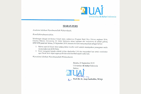 Kami berharap dengan adanya konfirmasi ini sivitas akademika UAI bisa turut mendoakan agar Faisal Amir dapat segera pulih dan sehat seperti sedia kala. Aamiin.