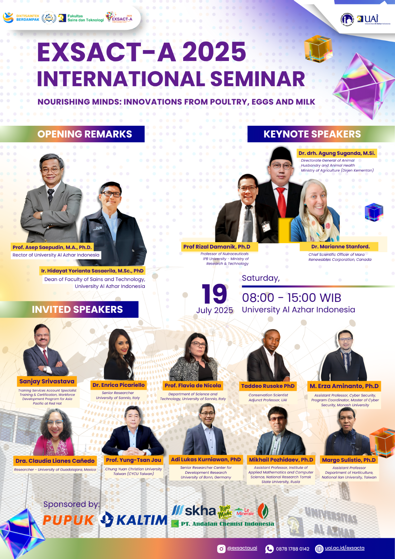 Exhibition and Seminar on Science, Art and Creative Technology – Al Azhar (EXSACT-A) is an is an event organized by the Faculty of Science and Technology, University of Al Azhar Indonesia (FST UAI) to invite scholars and practitioner in the world to share their experiences and research on all aspects of science and technology. There are several types of activities that will be held at EXSACT-A, including seminar activities, parallel sessions, poster sessions, and exhibition related to science, technology, creative and innovative product, etc.
