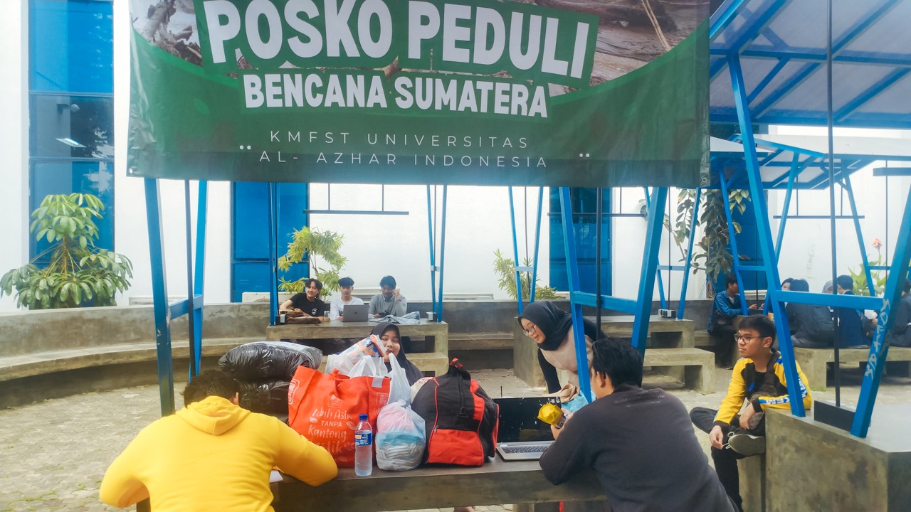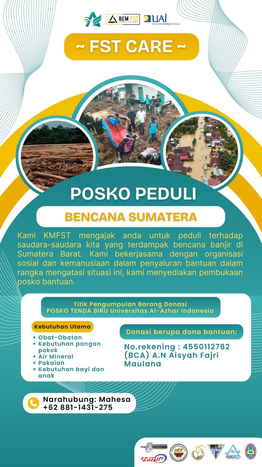 Keluarga Mahasiswa Fakultas Sains dan Teknologi (KMFST) Universitas Al-Azhar Indonesia melalui program FST CARE membuka Posko Peduli Bencana Sumatera sebagai bentuk kepedulian terhadap masyarakat yang terdampak bencana banjir di wilayah Sumatera. Pembukaan posko ini bertujuan untuk menghimpun bantuan dari civitas UAI dan masyarakat umum guna membantu meringankan beban para korban bencana.