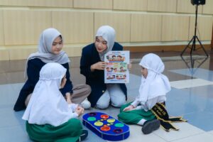 Beberapa media yang ditampilkan di antaranya Pattern Block Board”, “Petualangan Transportasi dan Luar Angkasa”, serta “Puzzle Kupu-Kupu”. Melalui aktivitas bermain dan eksplorasi, anak-anak belajar mengenal konsep dasar seperti bentuk, pola, dan urutan, sekaligus melatih konsentrasi, daya ingat, serta keterampilan mencocokkan dan mengelompokkan objek.