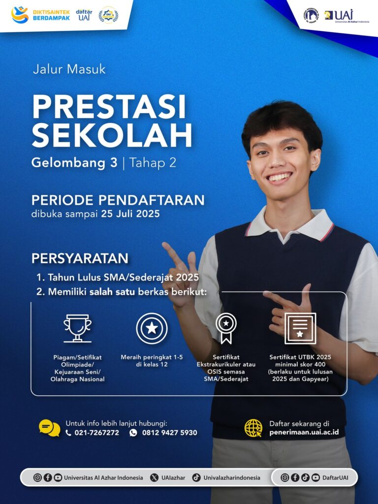 Jangan sia-siakan pengalaman dan prestasimu segera tukarkan dengan banyak keuntungan di UAI. UAI merupakan kampus Unggul yang berlokasi di Kebayoran Baru, Jakarta Selatan. Promo ini cocok untuk kamu fresh graduate yang masih bingung mau kuliah di mana. Cara daftarnya simple, cukup mendaftar di website penerimaan.uai.ac.id, pilih jalur prestasi, dan lampirkan sertifikat/bukti kamu siswa berprestasi. Tersedia 19 program studi yang terdiri dari sains teknologi dan sosial humaniora. Yuk segera daftarkan diri kamu, karena promo ini hanya berlaku sampai 25 Juli 2025. Daftar sekarang!