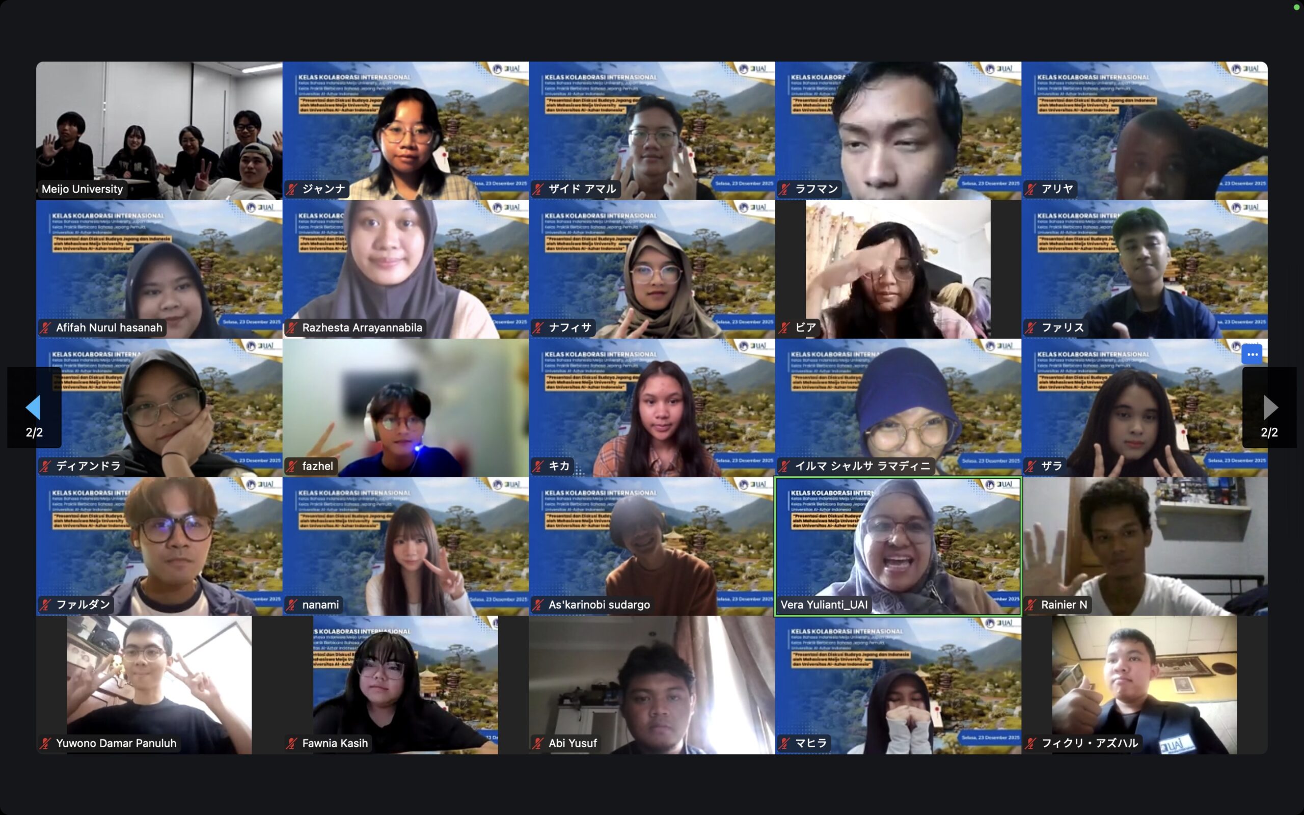 Program Studi Bahasa dan Kebudayaan Jepang Universitas Al-Azhar Indonesia (UAI) menyelenggarakan Kelas Kolaborasi Internasional bersama Meijo University, Jepang, pada Selasa, 23 Desember 2025. Kegiatan ini diikuti oleh 22 mahasiswa Prodi Bahasa dan Kebudayaan Jepang UAI angkatan 2025 dan 4 mahasiswa kelas Bahasa Indonesia dari Meijo University secara daring melalui Zoom.
