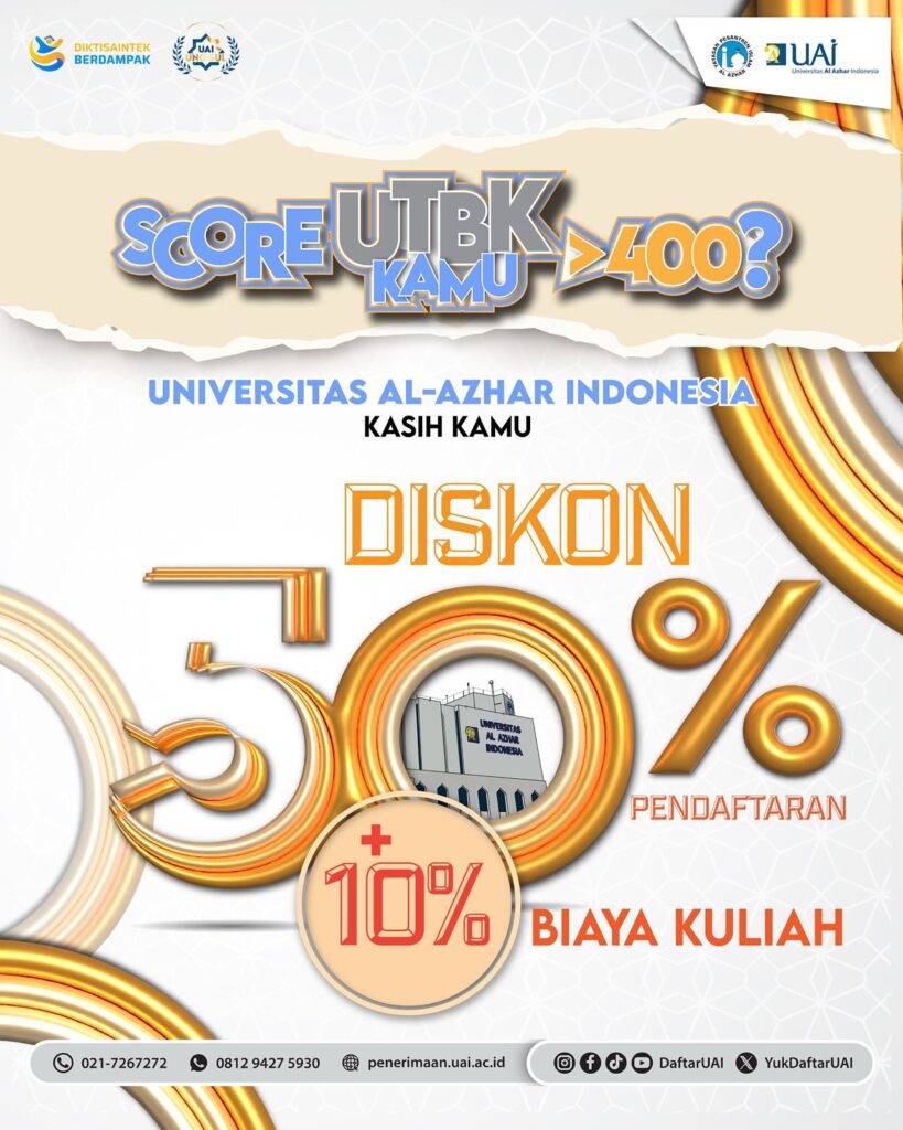 Buat kamu yang belum lulus di UTBK 2025, jangan merasa usahamu sia-sia. Ingat, masih banyak jalan menuju Roma!Dengan skor UTBK minimal 400, kamu sudah bisa mendapatkan potongan biaya kuliah. Seperti di Universitas Al-Azhar Indonesia (UAI), kamu bisa dapat potongan biaya pendaftaran sebesar 50% dan potongan biaya kuliah sebesar 10%. Potongan biaya kuliah ini berlaku akumulasi sampai kamu lulus. Besaran potongannya sampai dengan 10 juta rupiah, lho!