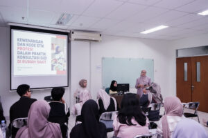 Dalam pemaparannya, Zahrina menjelaskan perbedaan peran dietisien dan nutrisionis dalam pelayanan kesehatan, termasuk kompetensi yang dibutuhkan dalam proses konseling gizi. Materi yang disampaikan mencakup komunikasi efektif, pendekatan patient-centered, serta metode konseling yang digunakan dalam praktik rumah sakit.