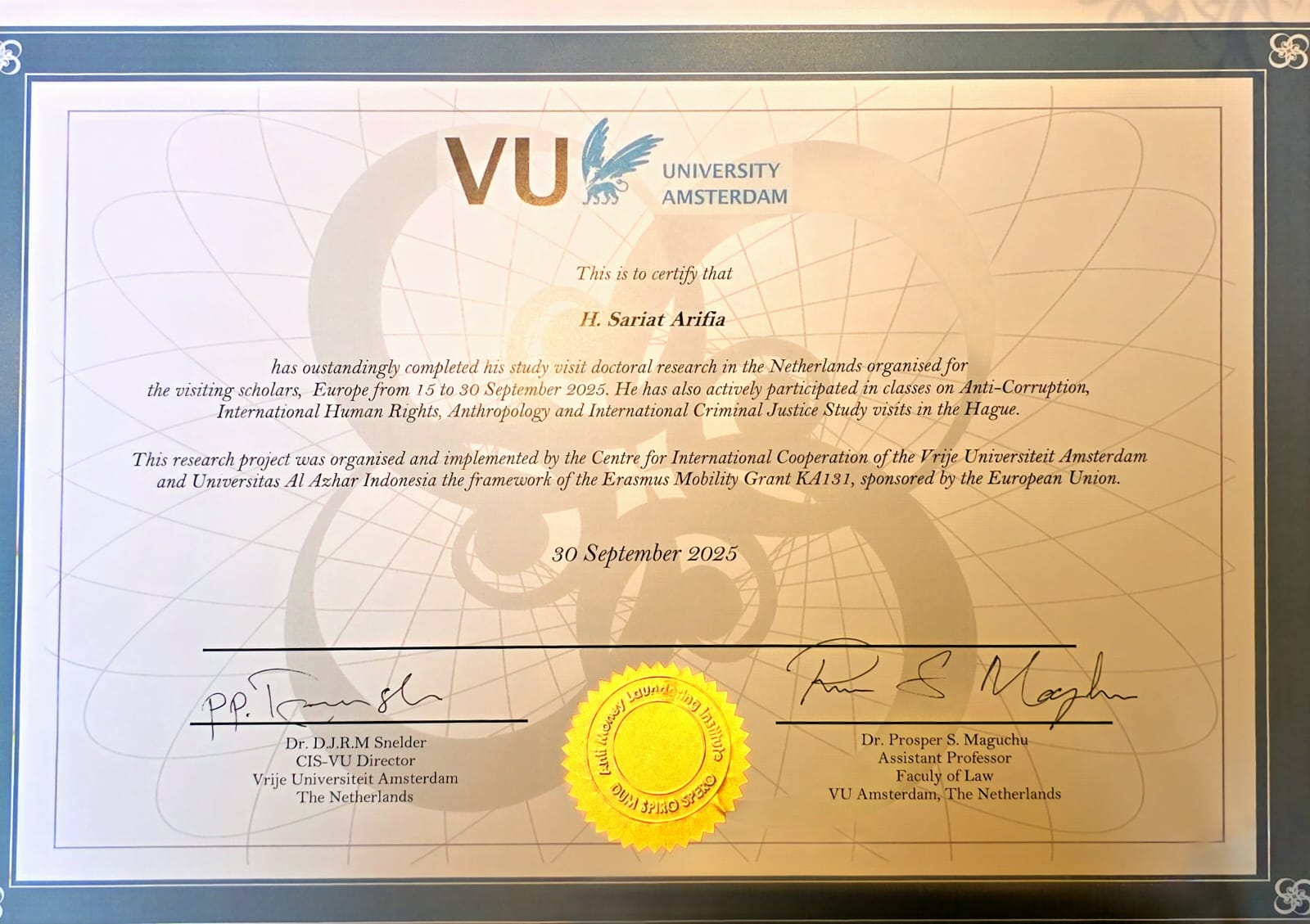 Dalam rangka penyelesaian studi doktoral di Fakultas Hukum Universitas Al-Azhar Indonesia (UAI), Sariat Arifia melaksanakan riset di Belanda selama dua minggu, mulai dari 15 hingga 30 September 2025. Penelusuran data dilakukan di Vrije University Amsterdam, Leiden University, Rijks Museum, Wereld Museum, serta sejumlah lokasi yang menyimpan arsip dan artefak terkait masa kolonial Belanda di Indonesia.