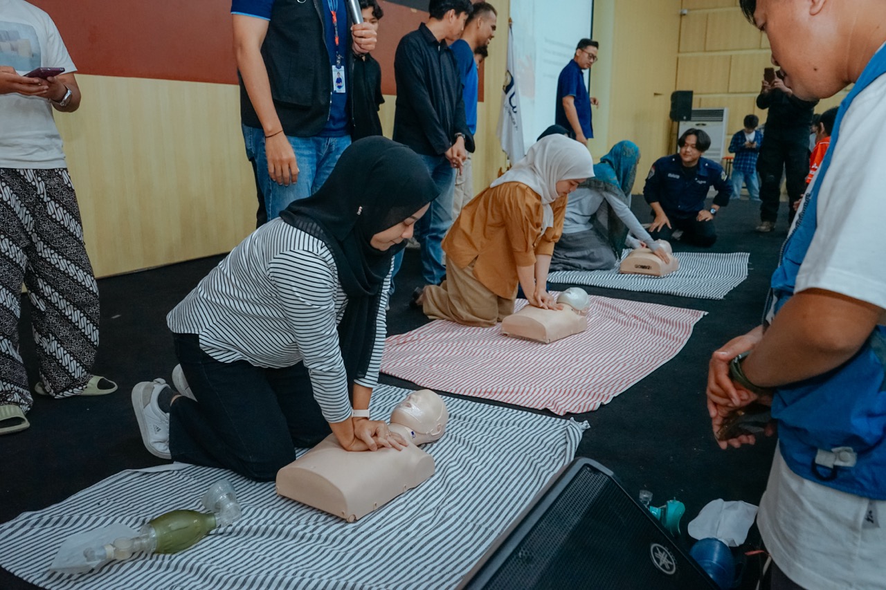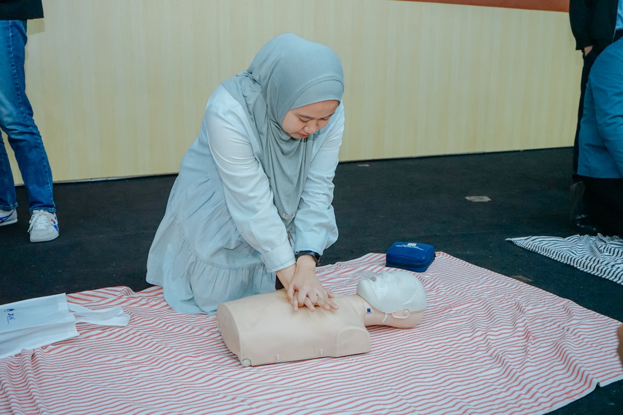 Para peserta kemudian berkesempatan mempraktikkan teknik CPR yang baik dan benar menggunakan alat simulasi berupa dummy. Peserta tampak antusias dalam mempraktikkan tahapan CPR. Selama praktik, mereka dibimbing langsung oleh Ari beserta para trainer dari PT Primamed Nusa Persada lainnya, sehingga tidak hanya memahami teori, tetapi juga memperoleh pengalaman langsung dalam melakukan pertolongan pertama.