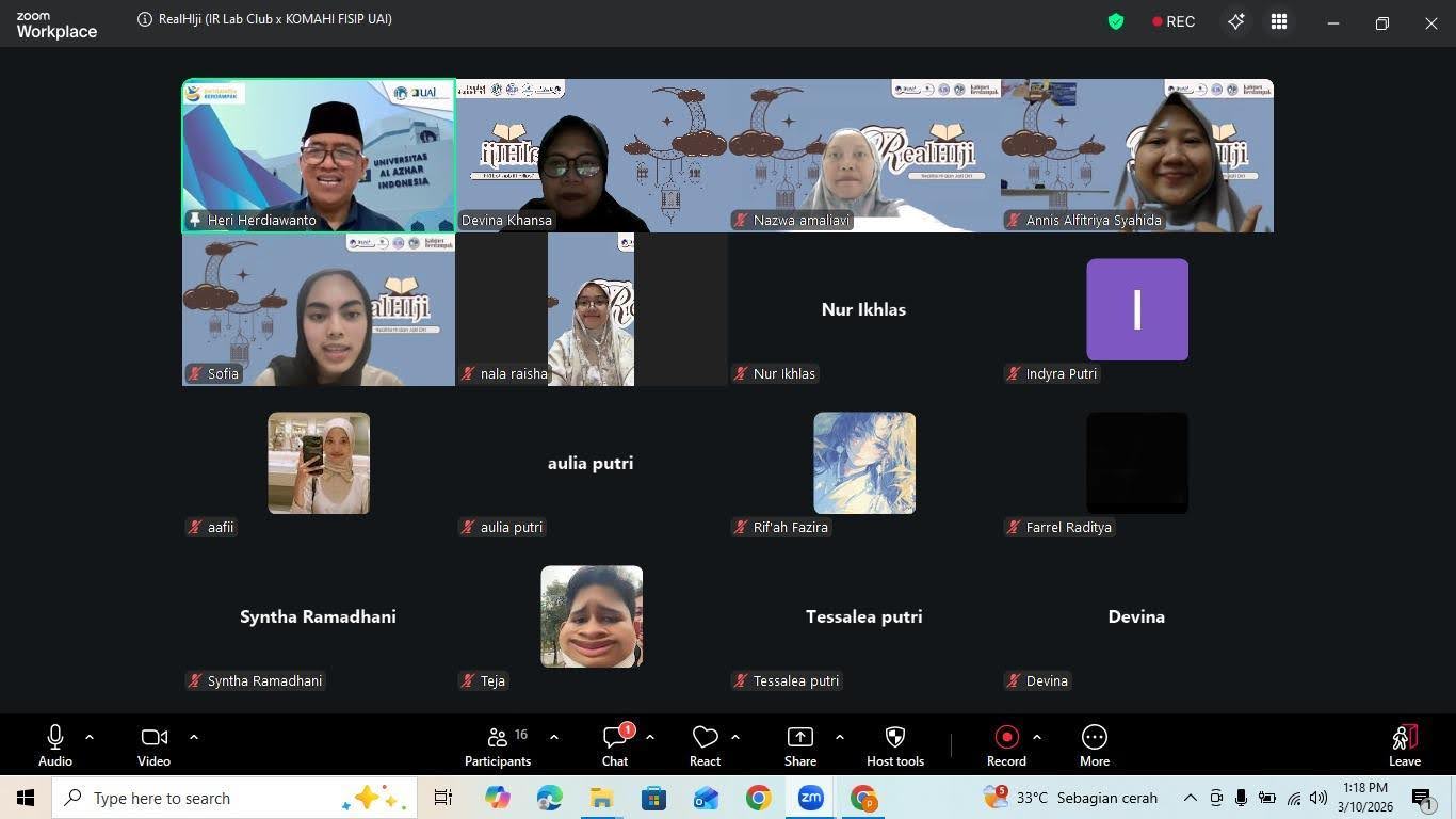Ramadhan tahun 2026 ini menjadi spesial bagi Mahasiswa Hubungan Internasional Universitas Al-Azhar Indonesia dengan hadirnya kegiatan RealHIji (Realita HI dan Jati Diri) yang diselenggarakan oleh Laboratorium HI berkolaborasi dengan Korps Mahasiswa HI (KOMAHI) sebagai ruang diskusi yang mengkaji ayat-ayat Al-Qur’an dan korelasinya dengan studi Hubungan Internasional. Kegiatan ini dilaksanakan di sela-sela kegiatan perkuliahan secara bauran (hybrid) dengan sesi luring di Yahya A. Muhaimin Room dan daring melalui Zoom Meeting selama sembilan hari pada 2 Maret-12 Maret 2026 yang secara resmi dibuka oleh Kaprodi HI UAI, Ramdhan Muhaimin, M.Soc.Sc.