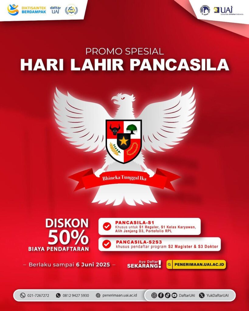 Yup, kamu nggak salah baca! Dalam rangka memperingati Hari Lahir Pancasila yang jatuh pada 1 Juni, UAI kasih kamu kesempatan emas buat daftar kuliah dengan potongan biaya pendaftaran! Ini dia kesempatan buat kamu yang sudah mantap pilih UAI sebagai kampus impianmu.