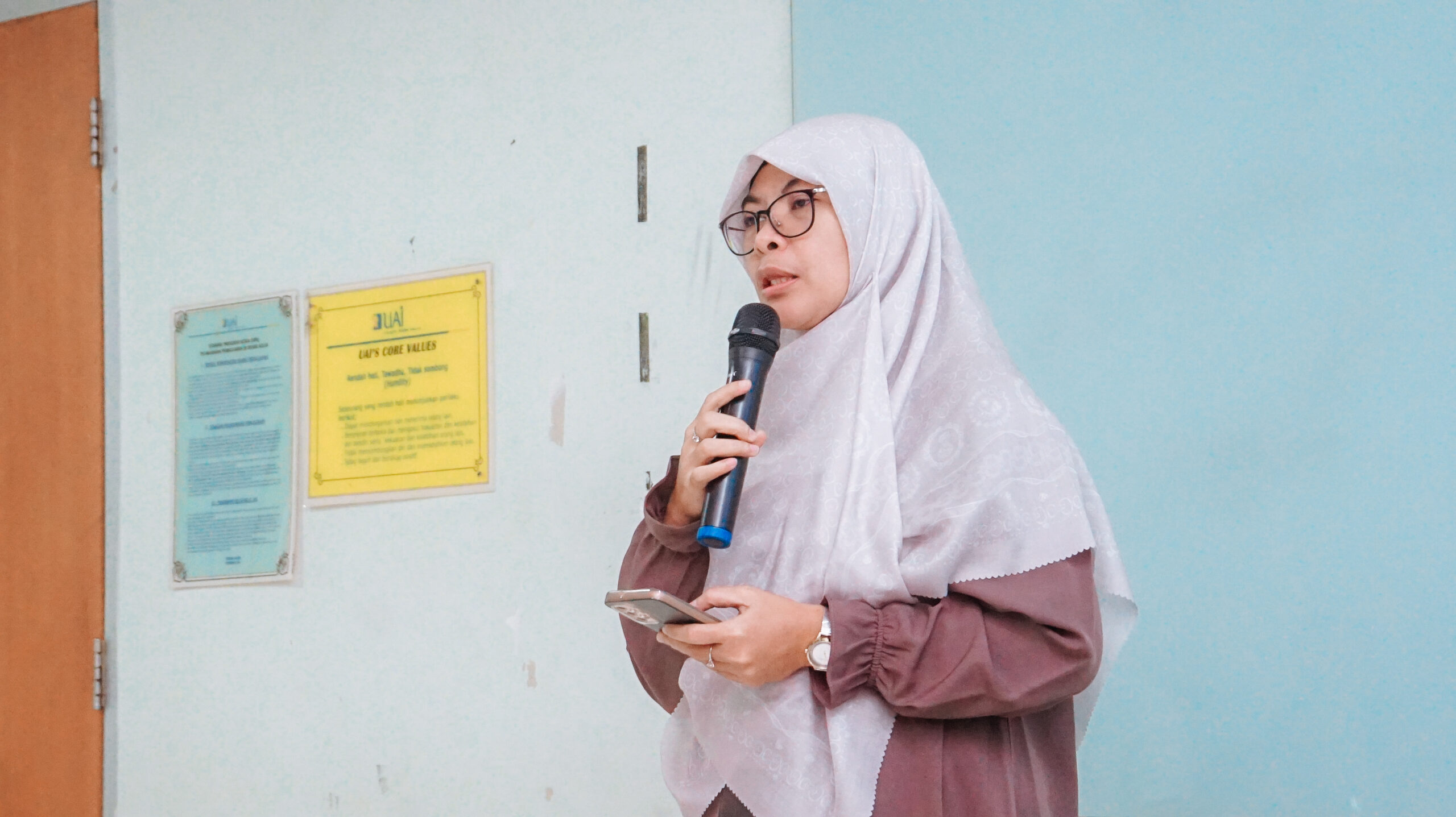 Acara dibuka dengan sambutan dari Direktur Kemahasiswaan UAI, Dr. Iin Suryaningsih, S.S., M.A. Beliau menyampaikan bahwa program kerja sama antara NQC dan UAI telah berjalan selama delapan bulan. “Kelas pelatihan mentoring ini dirancang untuk mengembangkan kapasitas peserta, khususnya dalam mengelola kelas tahfizh dan tahsin Al-Qur’an”, ucap Direktur Kemahasiswaan. Menurut beliau, pelatihan ini tidak hanya bermanfaat bagi para mentor dalam mengelola kelas, tetapi juga menjadi manfaat bagi diri sendiri.