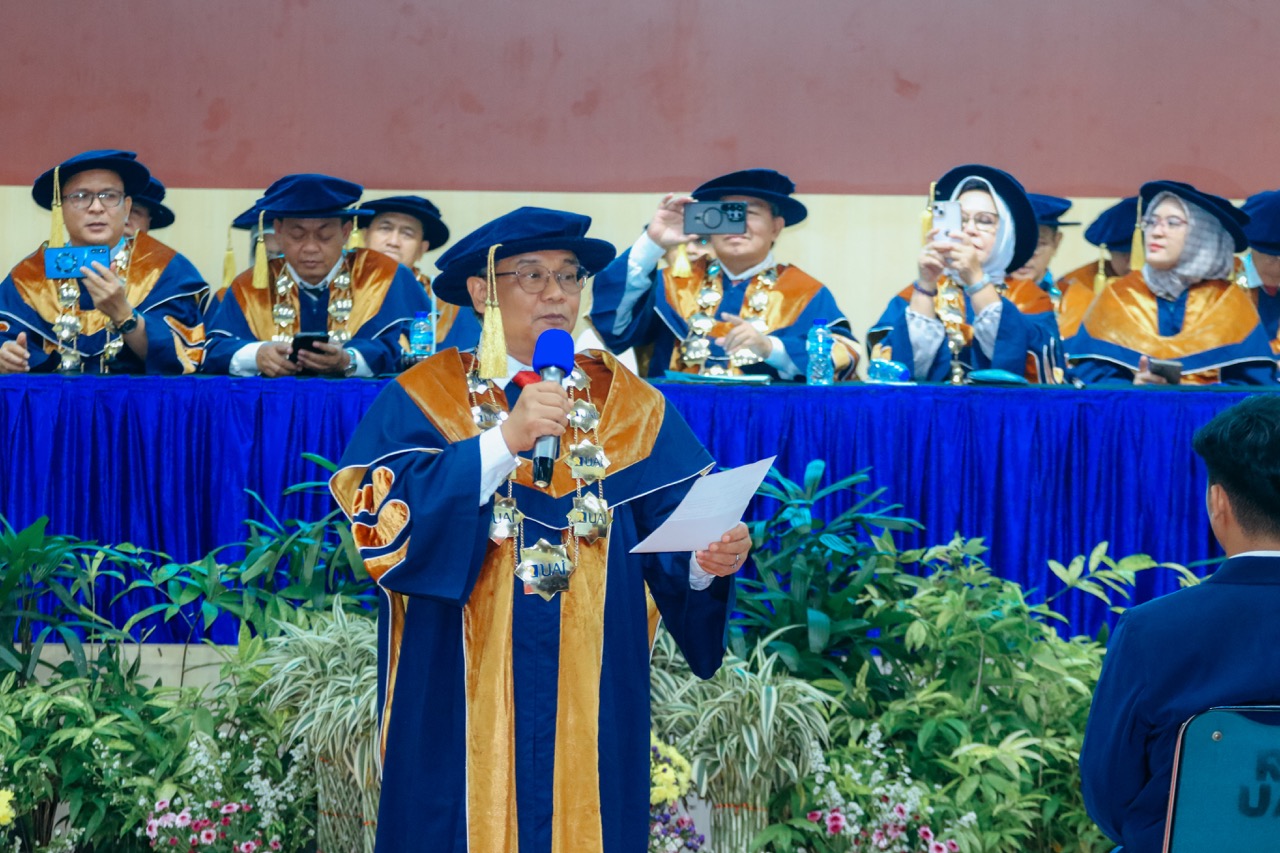 Pesan moral turut disampaikan oleh Prof. Dr. Suparji Ahmad, S.H., M.H., yang mengajak mahasiswa menjadi “mata air bagi bangsa”. Setelah penyematan almamater dan ikrar Janji Mahasiswa, Rektor memberikan orasi ilmiah “Gen FAST, Menyiapkan Indonesia Emas”, yang menekankan pentingnya generasi muda mengoptimalkan bonus demografi menuju 2045. “Terdapat tiga kunci utama bagi Gen FAST agar sukses, yaitu harus memiliki jiwa selalu ingin berkembang (growth mindset),semangat berkolaborasi, dan cintai proses dalam belajar”, pesan beliau.
