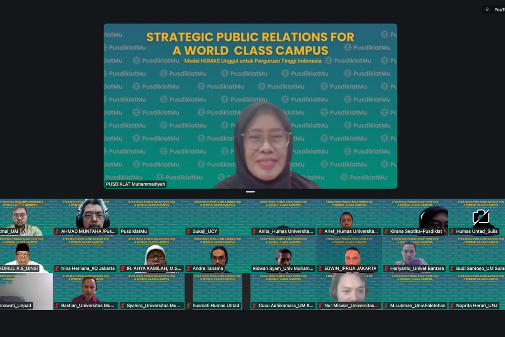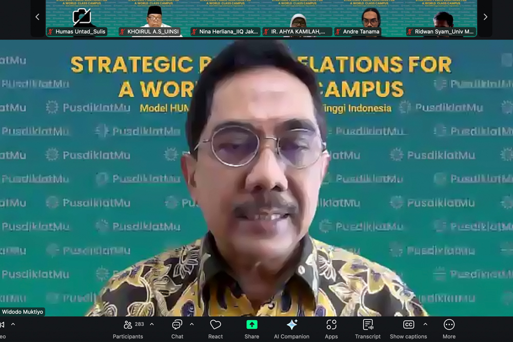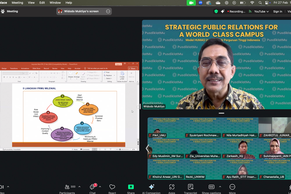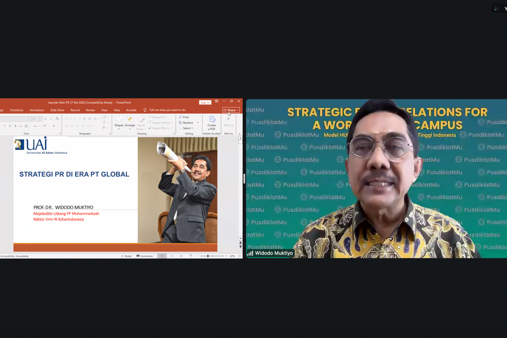 Rektor Universitas Al-Azhar Indonesia (UAI), Prof. Dr. Widodo Muktiyo, menjadi keynote speaker dalam Webinar Series #2 bertajuk Strategic Public Relations for a World Class Campus yang diselenggarakan Pusdiklat Muhammadiyah pada Jumat, 27 Februari 2026 secara daring melalui Zoom Meeting. Webinar ini mengangkat tema “Model Humas Unggul untuk Perguruan Tinggi Indonesia” dan diikuti ratusan peserta dari berbagai perguruan tinggi di Indonesia.
