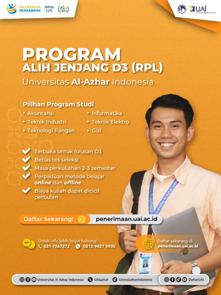 Universitas Al-Azhar Indonesia (UAI) adalah salah satu kampus yang menyediakan program perkuliahan ini. Jika kamu tertarik untuk mengkonversi pengalamanmu dengan SKS kuliah, kamu bisa mendaftar di Universitas Al-Azhar Indonesia. Kampus Unggul yang berlokasi di tengah Jakarta bisa menjadi tempat yang tepat buat kamu Yuk daftar sekarang! Daftar di sini!