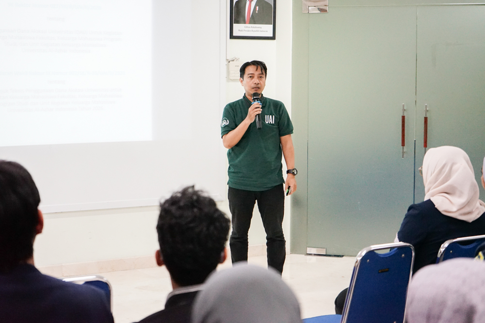 Kepala Bagian Kemahasiswaan UAI, Muhammad Fadli, S.E., M.H., memaparkan Surat Keputusan Rektor serta petunjuk teknis penggunaan Dana Alokasi Universitas (DAU) 2026 untuk mendukung kegiatan organisasi mahasiswa di Universitas Al-Azhar Indonesia. Ia menjelaskan bahwa program ORMAWA mencakup tiga kategori utama, yaitu kegiatan pembinaan, penguatan, dan pengembangan. Fadli juga menjelaskan mekanisme pengajuan proposal, penggunaan dana, serta pelaporan kegiatan sesuai pedoman pengelolaan Dana Alokasi Universitas.