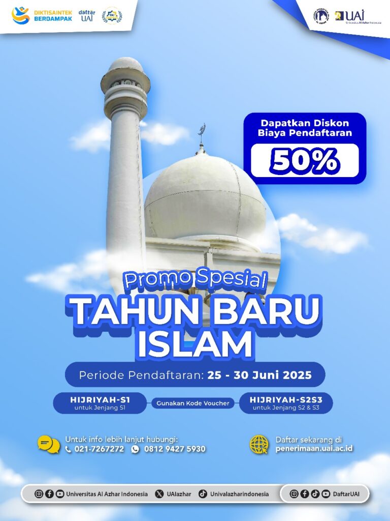 Universitas Al-Azhar Indonesia (UAI) memberikan potongan biaya pendaftaran sebesar 50% spesial menyambut tahun baru hijriah. Cukup hanya dengan memasukan kode voucher HIJRIYAH-S1 atau HIJRIYAH-S2S3. Biaya pendaftaran akan otomatis mendapatkan potongan 50%. Dengan begitu kamu otomatis bisa mengikuti tes seleksi, dan jika lulus kamu bisa menjadi calon mahasiswa baru Universitas Al-Azhar Indonesia
