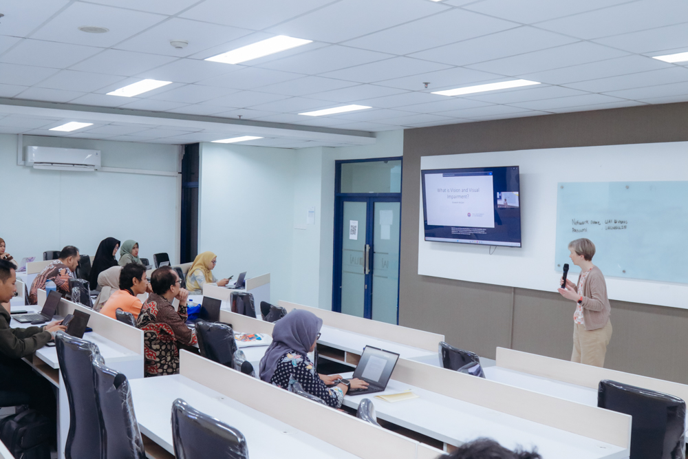 Kegiatan ini menghadirkan dua pemateri dari University of Edinburgh, yakni Prof. John Ravenscroft dan Elizabeth McCann. Para pemateri membahas pemahaman dasar mengenai disabilitas netra, ragam kondisi visual impairment, serta implikasinya terhadap aktivitas akademik, khususnya dalam proses membaca, menulis, dan mengakses sumber ilmiah.