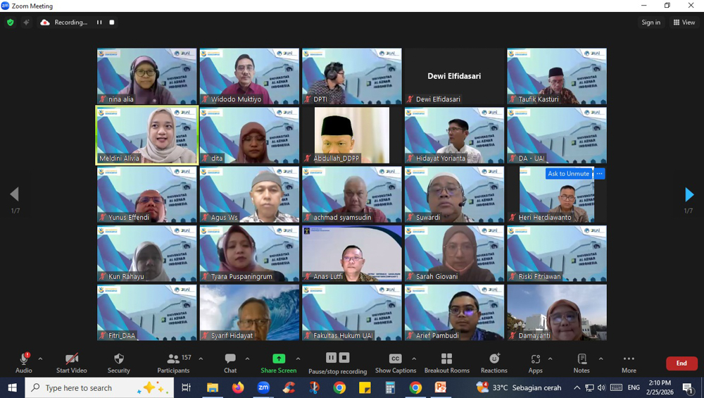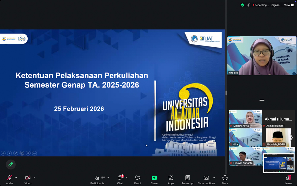 Direktorat Akademik Universitas Al-Azhar Indonesia (UAI) menyelenggarakan Sosialisasi Ketentuan Perkuliahan Semester Genap Tahun Akademik 2025/2026 pada Rabu, 25 Februari 2026, secara daring melalui Zoom. Kegiatan ini menjadi forum strategis untuk menyelaraskan kebijakan akademik sekaligus memastikan kesiapan dosen dan pimpinan unit menjelang dimulainya perkuliahan.