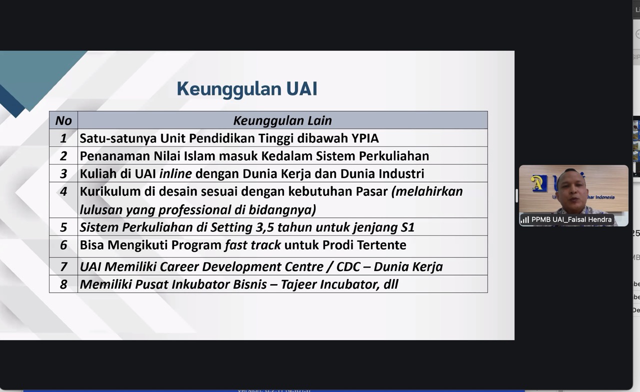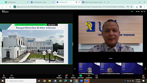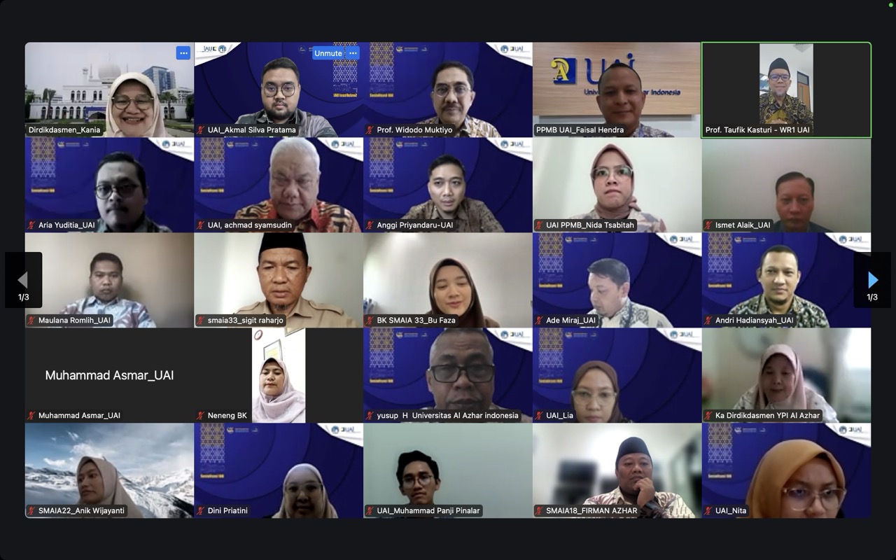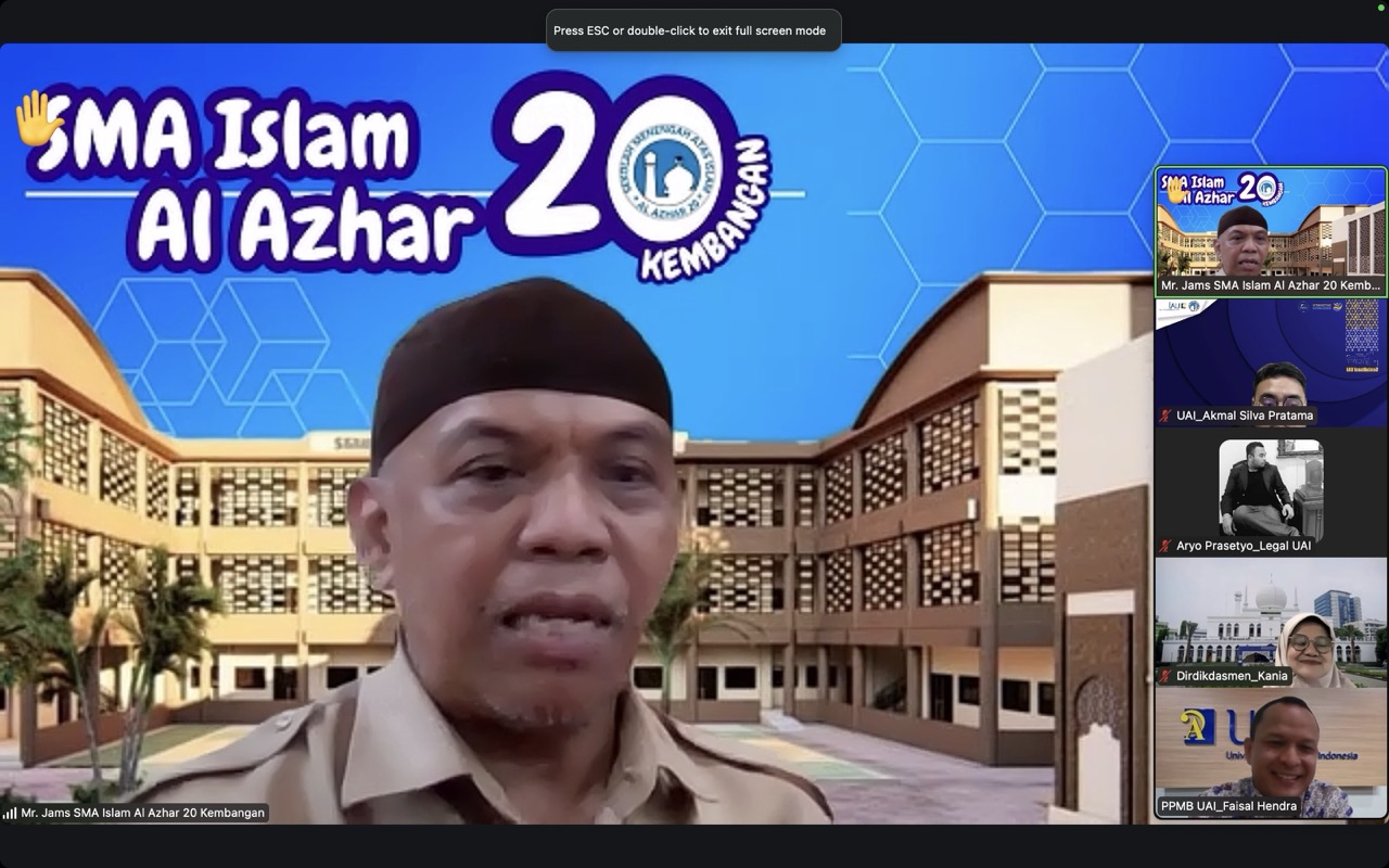 Universitas Al-Azhar Indonesia (UAI) mengundang Direktorat Pendidikan Dasar dan Menengah (Dikdasmen) Yayasan Pesantren Islam (YPI) Al Azhar serta perwakilan SMA Islam Al-Azhar untuk menghadiri kegiatan sosialisasi Universitas Al-Azhar Indonesia yang diselenggarakan secara daring melalui Zoom Livestream pada Rabu, 7 Januari 2025. Acara ini bertujuan untuk mensosialisasikan program pendidikan dan skema penerimaan mahasiswa Universitas Al-Azhar Indonesia kepada Dikdasmen YPI Al Azhar dan para guru BK SMA Islam Al-Azhar.