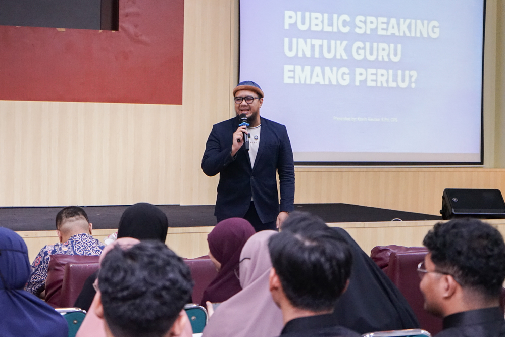 Kevin Kautsar, S.Pd., M.I.Kom., CT, selaku public speaking mentor dan content creator, berkesempatan untuk menyampaikan materi bertajuk “Public Speaking for Teachers: Belajar Ngajar”. Ia mengangkat tantangan yang sering dihadapi guru di kelas, seperti keterbatasan waktu dalam menyampaikan materi serta adanya kesenjangan komunikasi antara guru dan siswa.